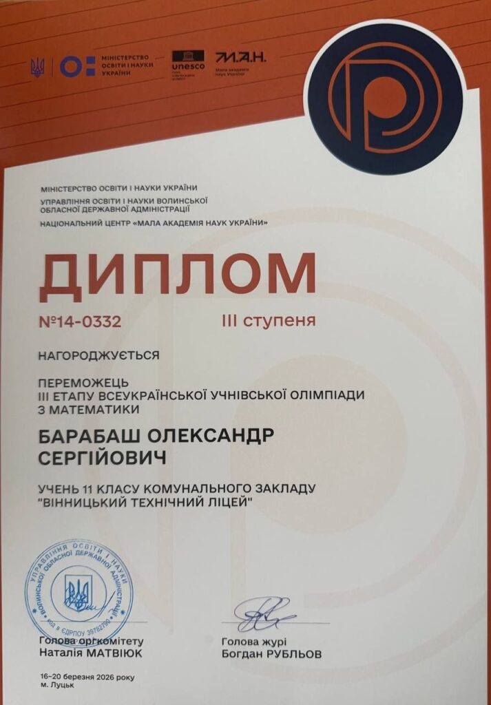 З 16 березня по 20 березня 2026 року в м. Луцьку проходив ІІІ етап Всеукраїнської олімпіади з математики. Цьогоріч команду Вінницької області представляли 5 учнів від нашого закладу.